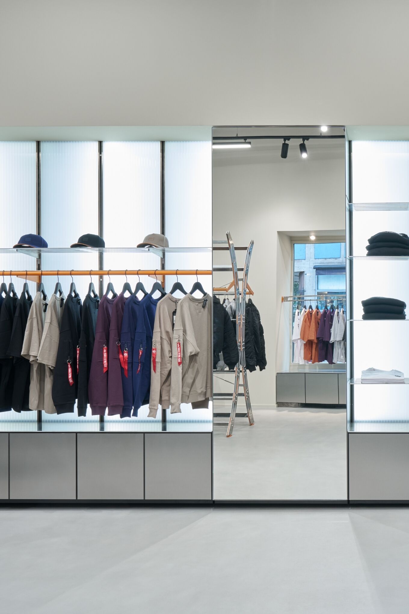 Known for their innovative approach to industrial design, they have crafted a space that embodies Alpha Industries’ legacy of military heritage while introducing a refined, contemporary edge. The design features clean lines, polished concrete, steel fixtures, and modular displays, capturing both the strength and simplicity that Alpha is known for.